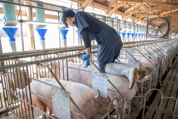 子育てを終えた母豚(離乳母豚)は、離乳から約5日後に再び発情を迎えます。そのサインを確認するため、母豚の前に雄豚を歩かせ、スタッフが母豚に刺激を与えながら1頭ずつ丁寧に発情確認を行います。