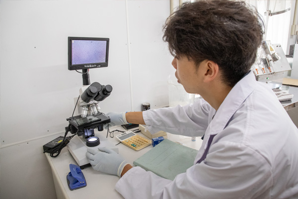 採取した精液は、希釈して量を調整した後、顕微鏡で精子の状態を詳細に検査します。異常がないことを確認した上で専用のパックに充填します。このパック1つが、母豚1頭への1回分の人工授精に使用されます。